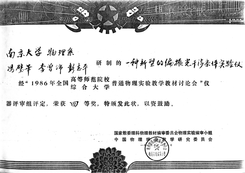 一种新型的偏振光干涉条件实验仪 荣获 全国高等师范学院综合大学普通物理实验教学教材讨论会仪器评审四等奖(国家教委理科物理教材编审委员会物理实验编审小组中国物理学会教学研究委员会)